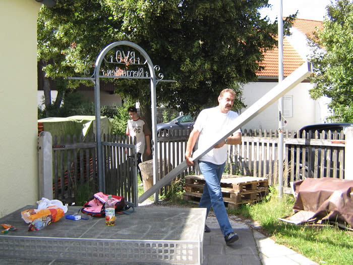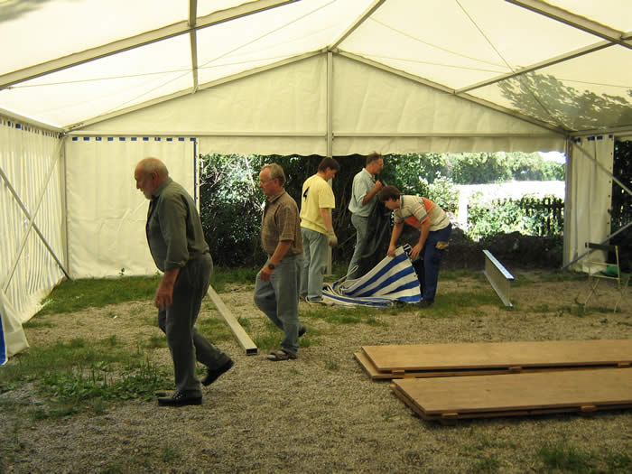 25-jährigen Vereinsjubiläum traf man sich im Vereinsgarten, um die vielen Alubalken, Zeltwände, Bodenbeläge etc. zu installieren.